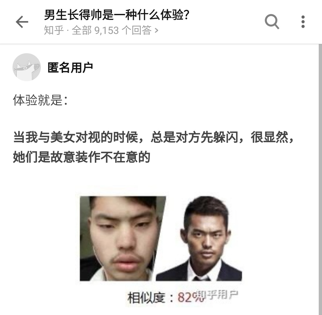 知乎上,“女生长得漂亮是种怎样的体验?”总共有4276个回答,而镜像问题“男生长得帅是种怎样的体验?”回答数是前者的两倍之多,当然不乏有人在这里搞行为艺术,但是评论区不经意的爆照,总能让人收获无尽的快乐。