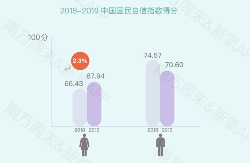 男性向来比女性更自信,但这个差距正在缩小。根据新氧和南方周末联合发布的《2019中国女性自信报告》,与前一年相比,中国女性自信指数提高了2.3%。而男生的自信指数降低了不少,开始变得自谦。