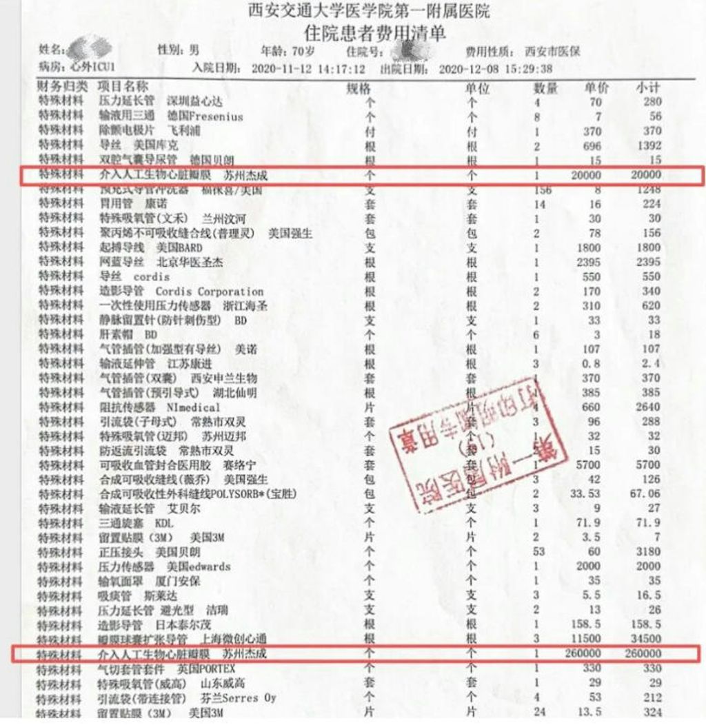 首先就是自費國產心臓瓣膜,手術前並未讓家屬簽字確認。李女士父親體內被植入了兩個心臓瓣膜,其中一個被收取28萬元費用,另一個未出現在病例上,這也讓監定機構難以進行監定診療責任。