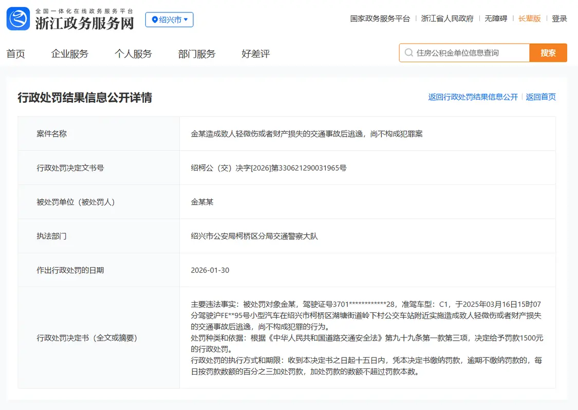 行政处罚决定书显示,被处罚对象金某,驾驶证号3701*****x******28,准驾车型:C1,于2025年03月16日15时07分驾驶沪FE**95号小型汽车在绍兴市柯桥区湖塘街道岭下村公交车站附近实施造成致人轻微伤或者财产损失的交通事故后逃逸,尚不构成犯罪的行为。
