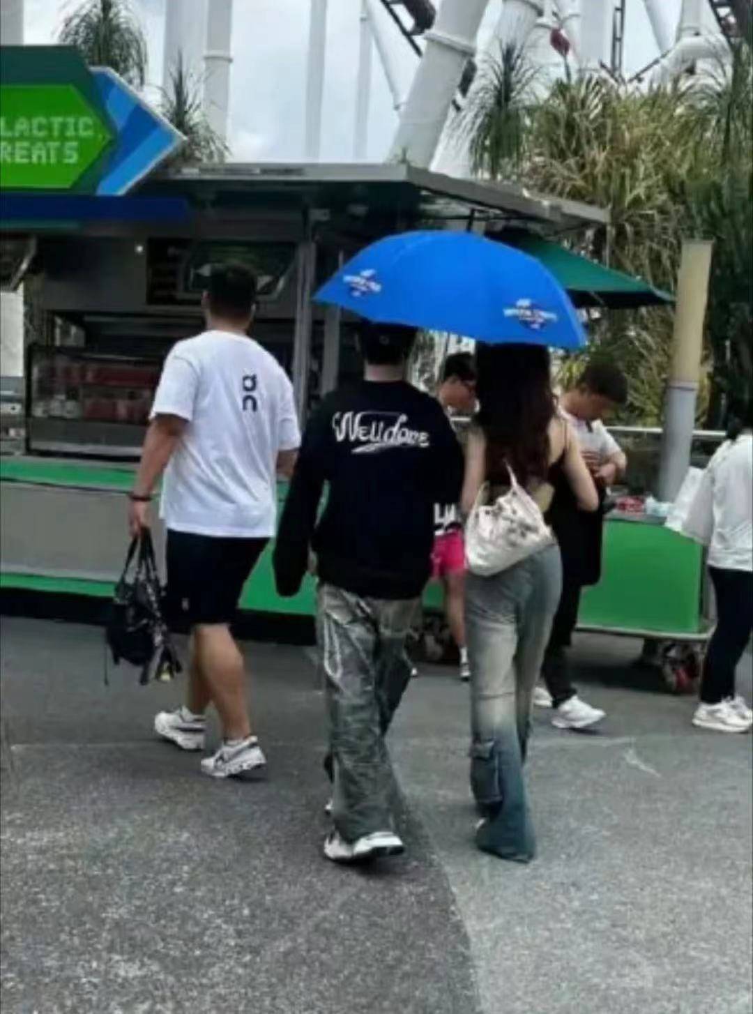 环球影城被多位网友偶遇,与一名年轻女子同游,两人共撑一把蓝色遮阳伞,手持
