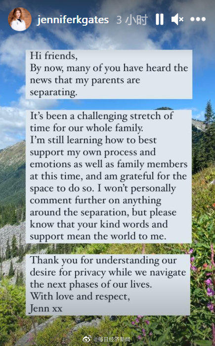 在社交媒体上发声,称全家人度过了“一段充满挑战的日子”。而比尔和梅琳达两人也分别在社交媒体上发出了联合