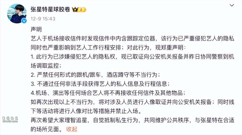 此前,12月9日,张星特工作室官方微博@张星特星球胶卷 曾发声明,抵制“私生(指行为极端、作风疯狂、侵犯明星私生活的粉丝)”行为。