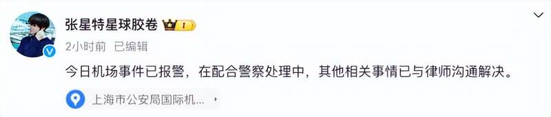 今日中午,工作室发文表示,“今日机场事件已报警,在配合警察处理中,其他相关事情已与律师沟通解决。”工作室发出该微博的定位为“
