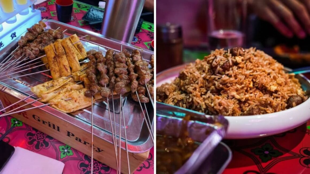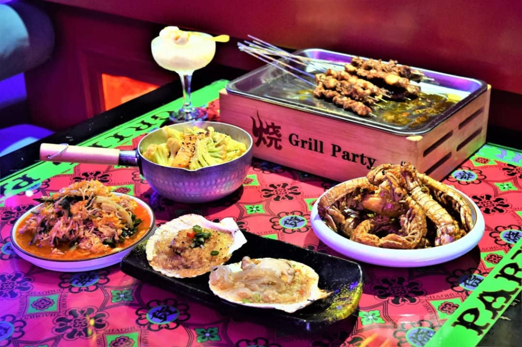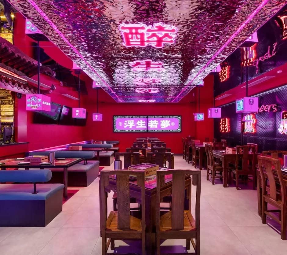 该烧烤店于 2023 年 2 月开业,融合了中国东北街头餐馆的氛围与灯红酒绿的酒吧情调。