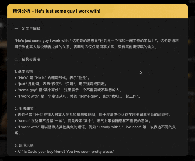 每个切片都带精讲分析,「详细解释-结构分析-用法细节-语境示例-使用总结」一应俱全,像一位随身携带的英文老师。