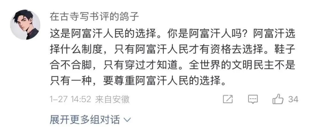 下面这个留言虽然说的也很无耻,但有一句话他说的很对,是阿富汗人的选择。