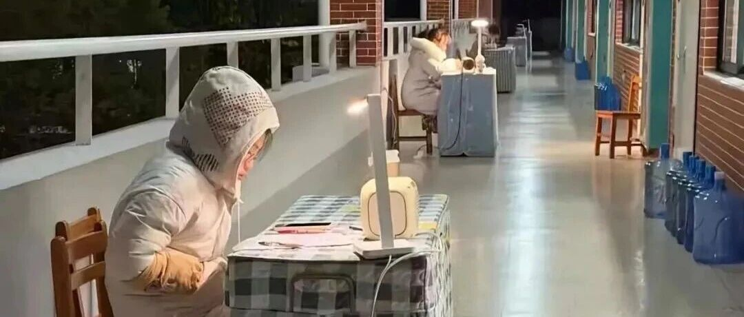 这是一次完美的行动。笔直的排列,每张办公桌上量身定制的统一布罩,看样子还有独立的电源(没有看到从教室拉出来的电线),台灯,取暖器……感觉领导还怪好的嘞。