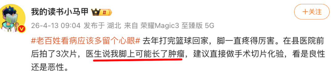 也有不少网民在词条下面爆料,连300多万粉丝的大v都自述经历,县医院将脚痛误诊为肿瘤需手术,留了个心眼去三甲医院一查,吃了点药两天就好了。