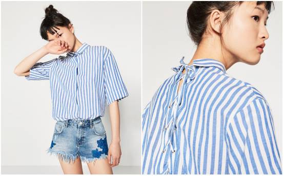 竖条纹衬衫也是衣橱必备吧,可是Zara这件美就美在背后的交叉束带小心机。另外这件衬衫是长款,直接当oversize光腿穿也是完全可以的 ▼
