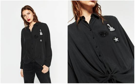 至于纯黑色衬衫,也要拒绝乏味。胸前的吉他和星星补丁,blingbling地就提亮整身look。长衬衫的关系,下摆可以挽起来变成一个结,chic不少 ▼