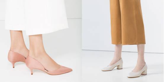高跟鞋中的小矮个——5cm以下的鞋,是对新手很友好的。左边这个粉色细中跟,我已经能想象到它能让你的腿长变两米;而右边这双圆头粗跟,配上一些麂皮裙,一定优雅极了。