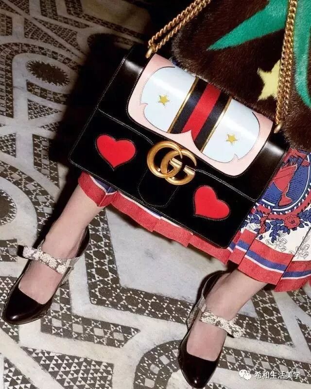 2016 早秋系列里面,Gucci 在传统的GG logo包袋中运用了各种心形、星星、几何等图案,梦幻又有趣,散发出年轻的少女味道。可以说是有少女又时髦的典范了。