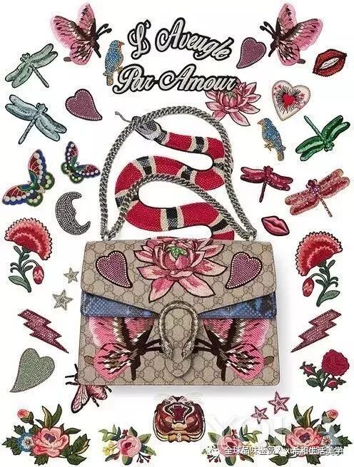 2016春夏的Gucci 酒神设计,更像是一场搞怪甜美的少女的狂欢,设计师Alessandro Michele把帆布酒神包当做了一块画布,大自然的花鸟鱼虫、还有各种搞怪的小图案全都用起来了。