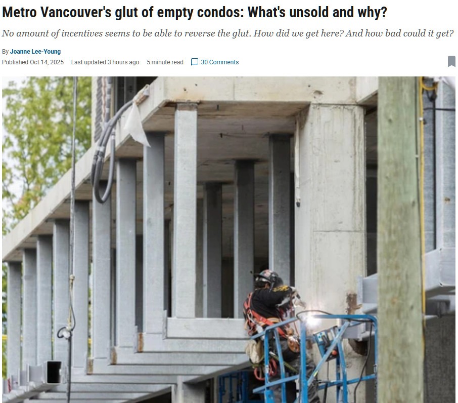 根据房地产数据公司 Zonda Urban 的数据,2025 年第一季度,大温地区已竣工但未售出的公寓和联排别墅数量为 2,304 套。到第二季度,这一数字攀升至 3,215 套。第三季度的数据将在三周后公布。