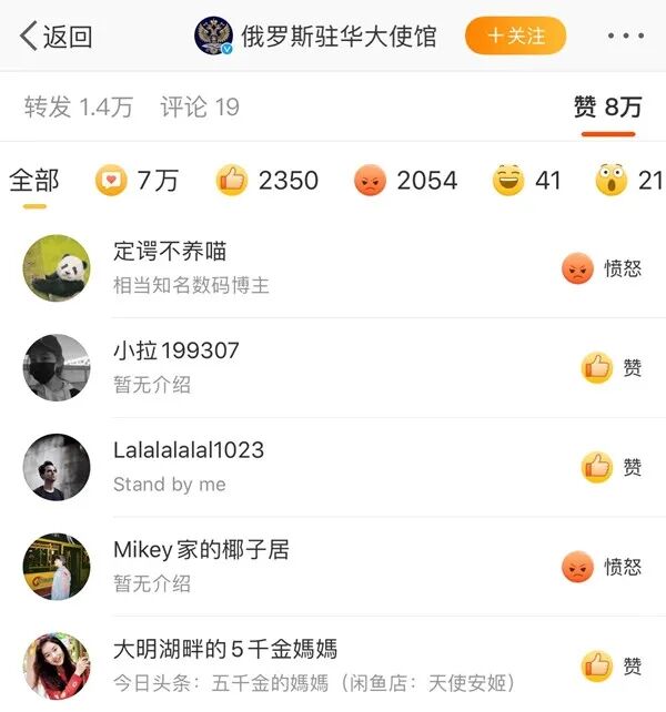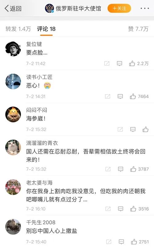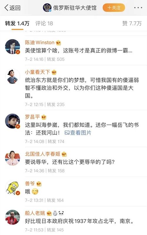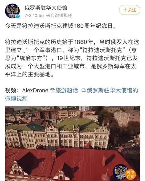比起美国大使馆官微,俄罗斯大使馆一直没什么影响力,基本就被忽视,美国大使馆官微下面就很热闹,经常吵得不可开交。俄罗斯官微可能太寂寞了,或者嫉妒美国官微的人气,总想搞点事,这次俄罗斯成了话题主角,在微博高调纪念符拉迪沃斯托克(意思为统治东方)建城160周年,这个名字我还特意百度了一下,真记不住,因为这不是我们的名字,我们叫海参崴。