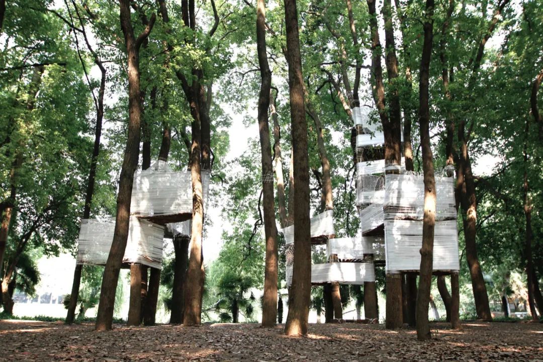 “絲房”選址在了華中科技大學的一片樟樹林中,用鋼絲形成空間結構,用白色麻繩維護結構,展現外觀。房子的創意來自一群6-12歲的孩子,穆威只是在創意的基礎上,增加安全性的設置,建房子的同時,還給孩子上了一節安全教育課。