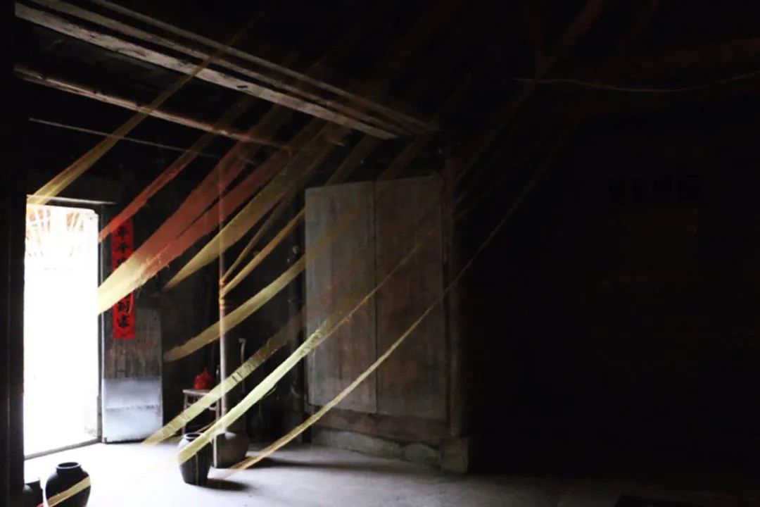 在那里临时做了黑纱系列的最后一件作品《光》,黄色的柔和的纱挂在门口,就是一个光的空间,中间有燃烧着火空间,里面祠堂的棺材上,有悬挂的黑纱,就像是每一位老人对死亡的寄语。