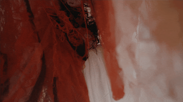 红色的纱和布层层叠叠地软软铺开,整个作品长、宽都是4米多,高1.5到2米之间,取决于布料的延展,它带来的感受就很像子宫本身。