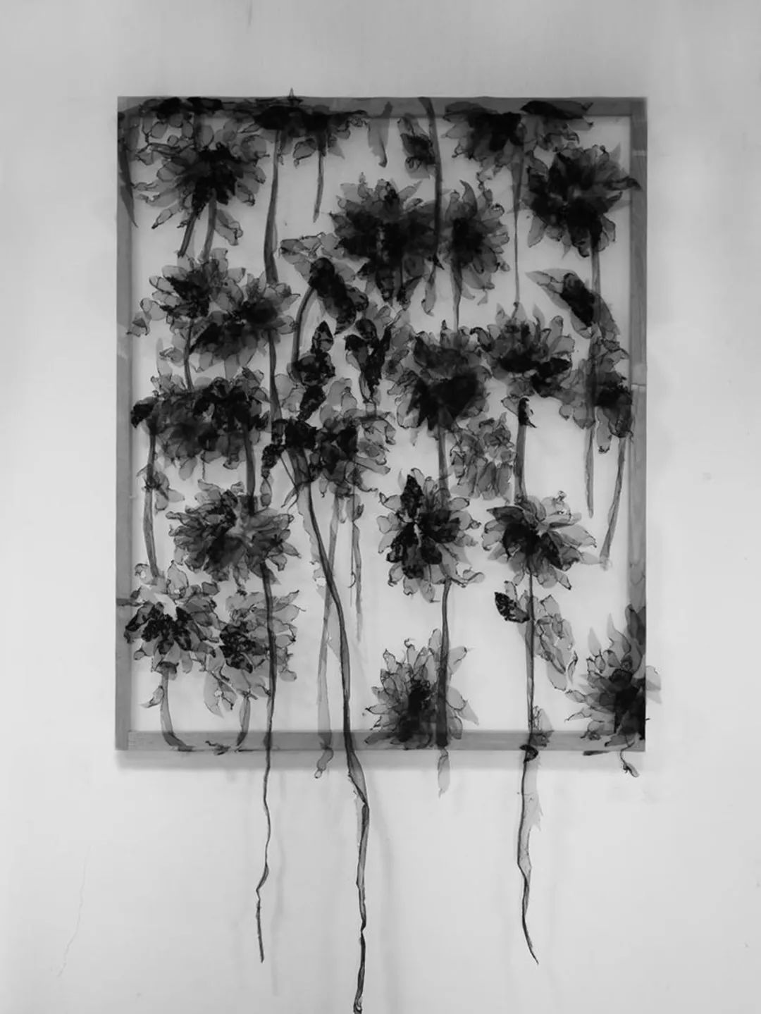 我把从葬礼上带回来的黑色“戴孝布”和丧葬“烧纸”的概念结合在一起,用火烧黑纱的边缘,缝制出许多黑色的向日葵。火在中国人的心中是通灵的,连接着两个世界,希望能把我内心最柔软的东西寄送给爷爷。