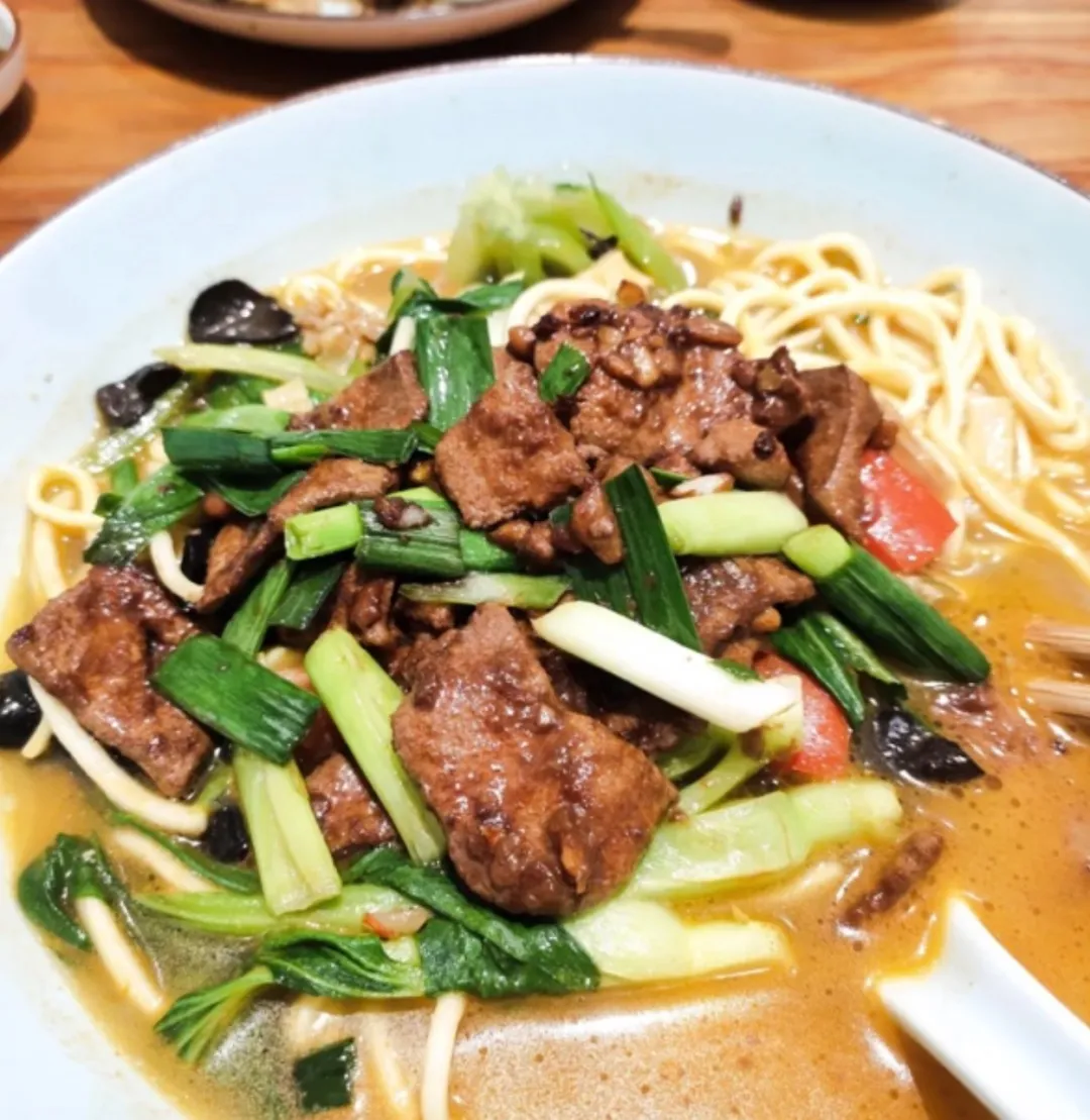亲眼看见拉拉面的大哥挥手、旋转、揉面团,忙点的时候满头大汗~捞起的面有几分嚼劲,蘸着汤汁滑爽入口,开心。