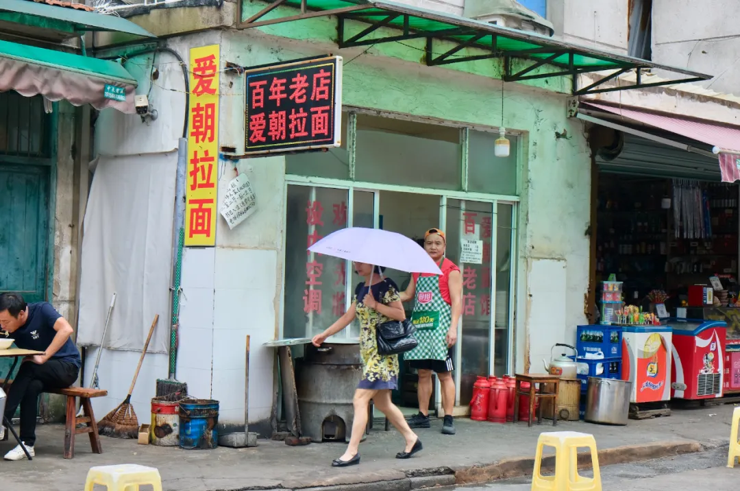 爱朝拉面就在卫民拉面隔壁的隔壁,生意顶顶好。它的招牌上写着百年老店,还没进去前期待值就蹭蹭上升。