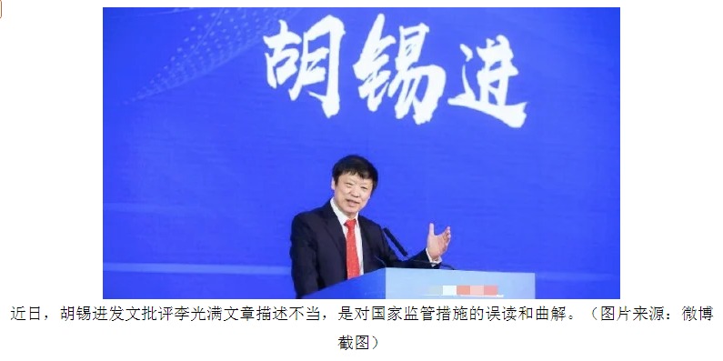胡锡进还批评,“文章用一种特殊的檄文口吻描述中国正在发生的变革,仿佛这个国家要告别改革开放以及十八大以来的基本路线方针政策,要形成某种秩序颠覆,真的要‘革命’了,这确属严重的误判和误导”。