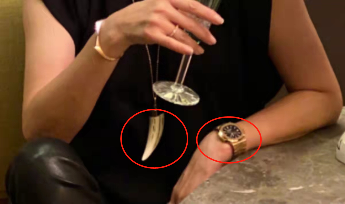 照片中,刘嘉玲化着淡妆,皮肤白皙紧致,几乎看不出什么皱纹,她身着黑色无袖上衣,四肢纤细,手腕上戴着某达翡丽的金表,要价高达38万元人民币,脖子上还挂着疑似象牙的吊坠,整个人看起来雍容华贵、气质优雅。