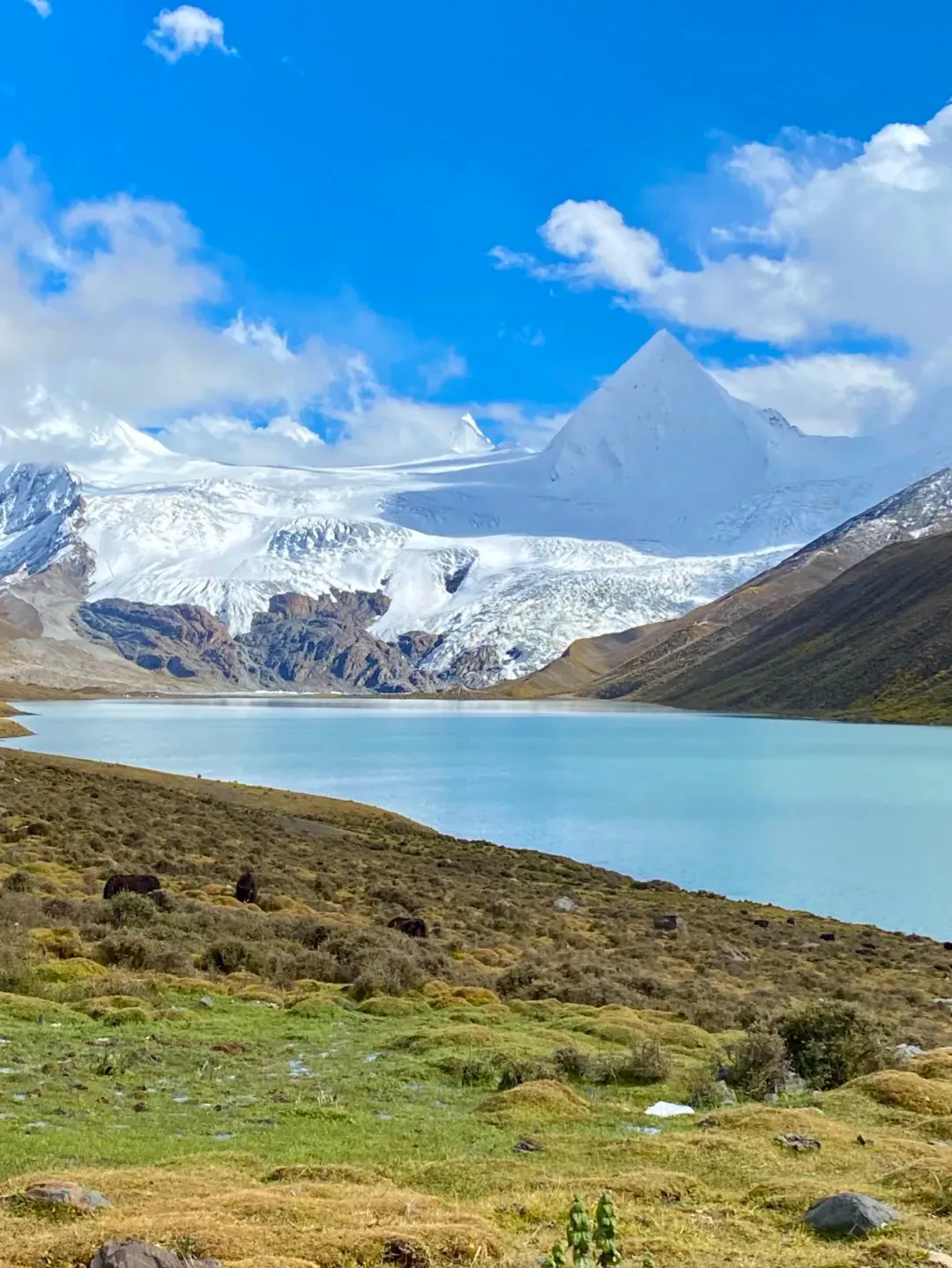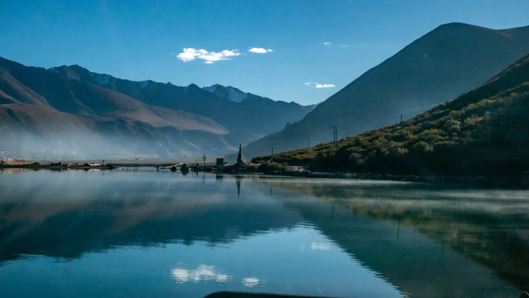在正式穿越麥地卡濕地之前,可以去縣城南邊的嘉乃玉錯,驅車十幾分鍾即可到達湖邊。早晨的時候山間霧氣還未消散,湖面非常平靜,遠處的雪山倒影其中,湖邊牛羊悠悠,一派祥和靜謐。