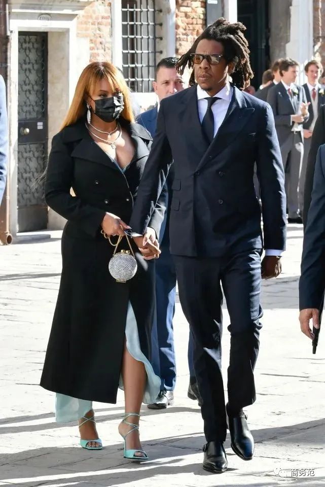 最近和Tiffany打得火热的碧昂丝和Jay-Z夫妇自然也不能少,碧昂丝一身黑色大衣,提了一个Marzook的水晶包。