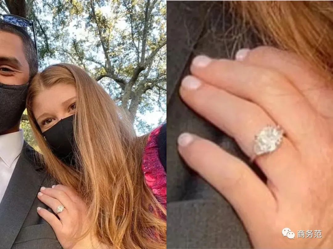 虽然婚戒“普普通通”,订婚戒指可是分分钟闪瞎眼的节奏。两个人在沙漠度假时,Juan掏出了这枚巨大的钻戒向她求婚。