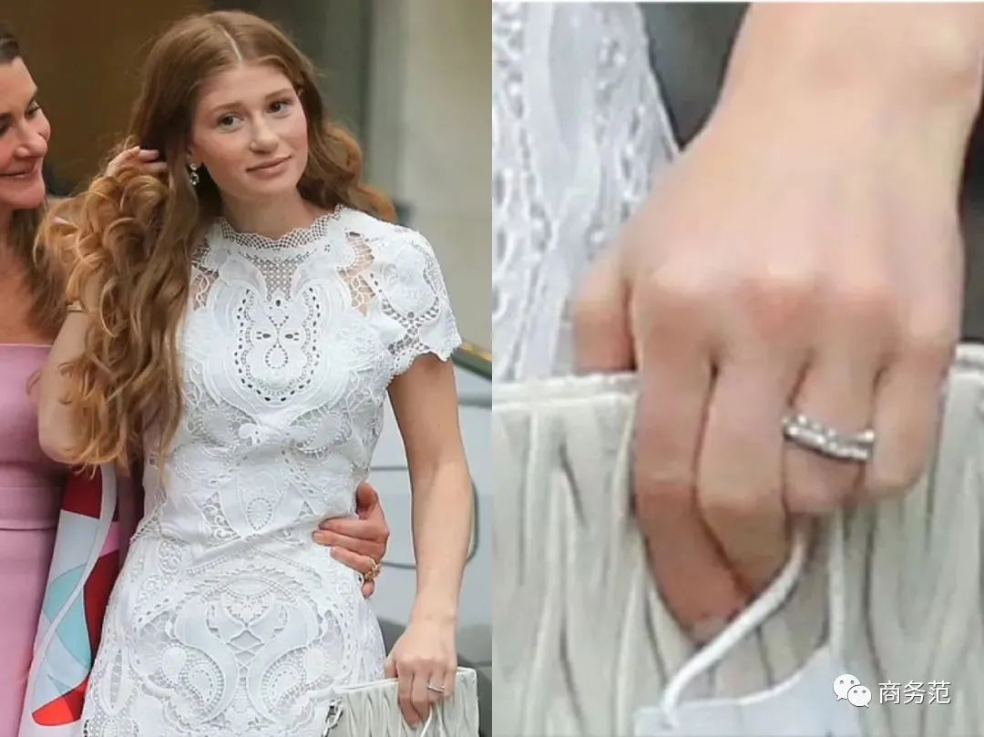 婚礼前还被拍到戴了另一枚戒指,是由钻石环绕组成的“钻石带”,也代表着永恒。据珠宝商分析,这枚婚戒由祖母绿切割的钻石组成,估计总重达十克拉,虽然没有主钻,但是也壕到不行。