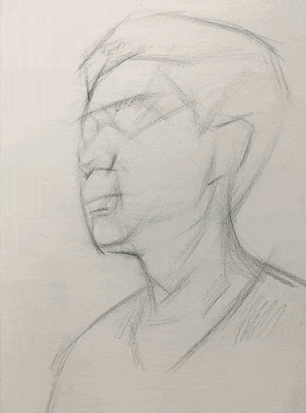 技巧:加強整個額區及顳區的填充提亮,陰影打在兩腮部及頦部。