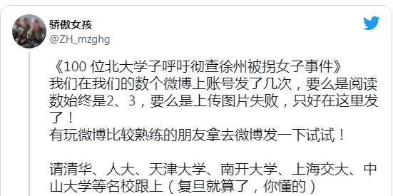 网传北大的呼吁信写道,“我们是100位曾经就读于北京大学的普通学子,位卑未敢忘国忧。近日徐州被拐女子杨某侠的悲惨遭遇引起全国人民的广泛同情和高度关注。作为一个新时代中国梦的建设者,我们对于杨某侠的遭遇感同身受,寝食难安,悲愤不已!”