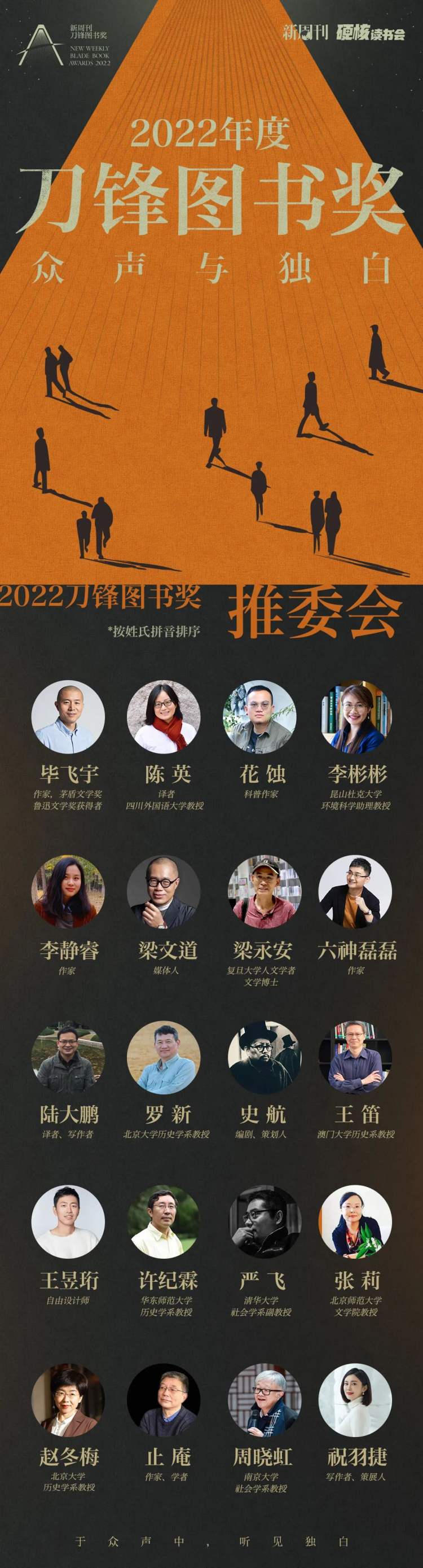 2021年首届刀锋图书奖的主题为“低音与棱角”,2022年刀锋图书奖的主题为“众声与独白”,我们希望呈现的是一个关注多元、关怀个体的图书榜单。今年,刀锋图书奖将推出四个季榜、一个年榜,邀请读者一起从书中解读时代的众声与独白。