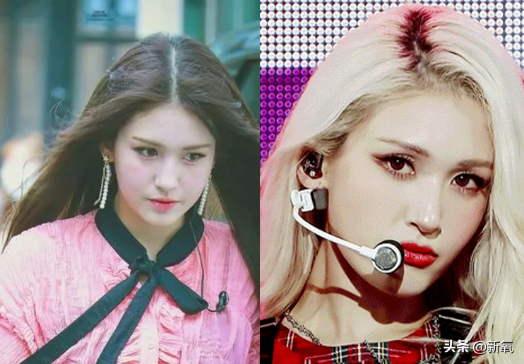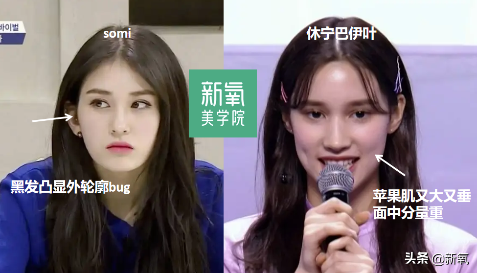 因为在黑发充当背景板时,头发与脸蛋形成高强度的色彩对比,很容易暴露面部内外轮廓的bug,比如somi的颧骨微扩、休宁冗沉的面中