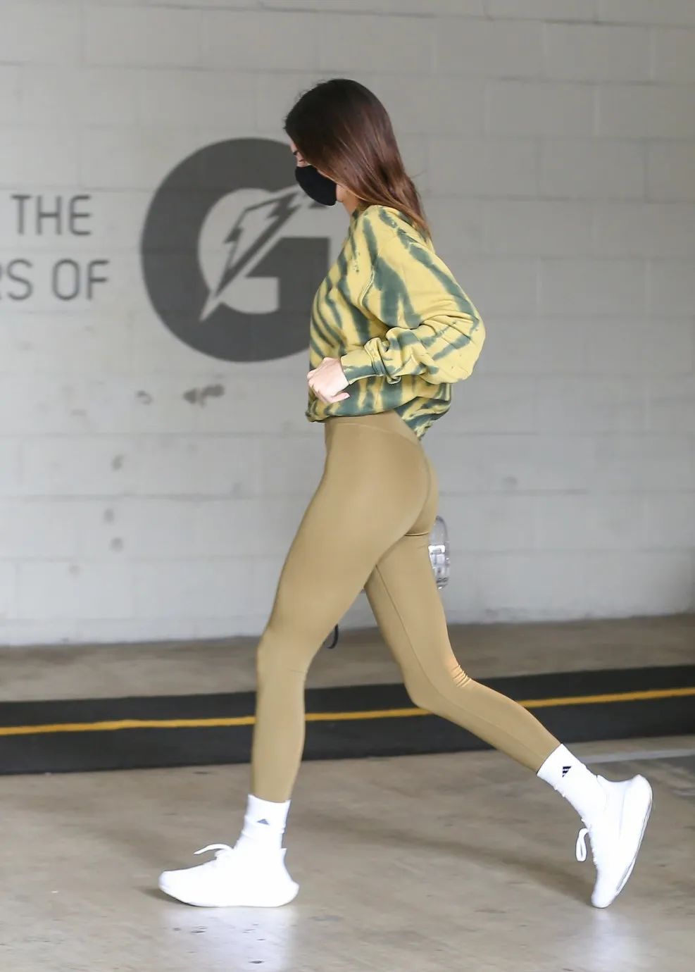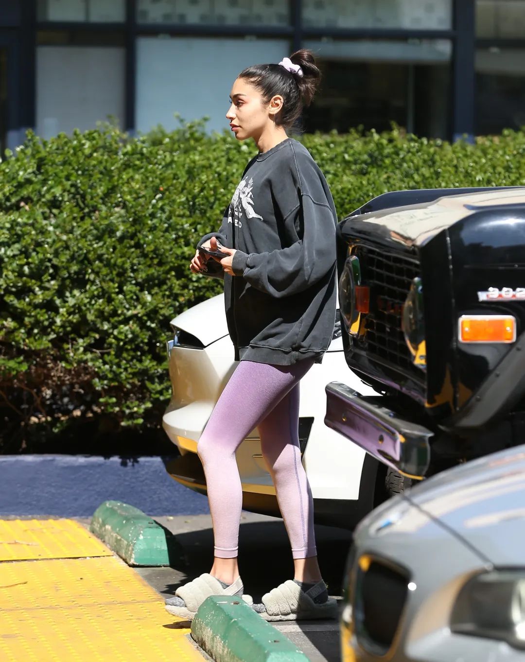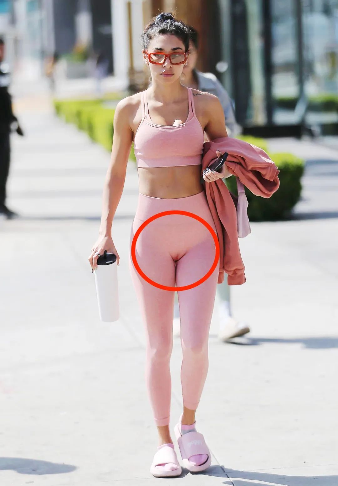 不管是不是leggings,光面材質的單品都更顯胖,突顯身材的leggings更不用說了。相對不算瘦的Vanessa Hudgens穿珠光leggings就有點顯胖: