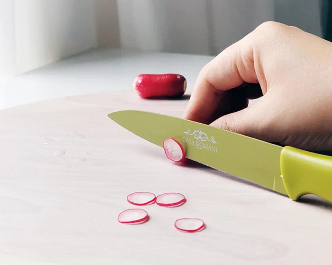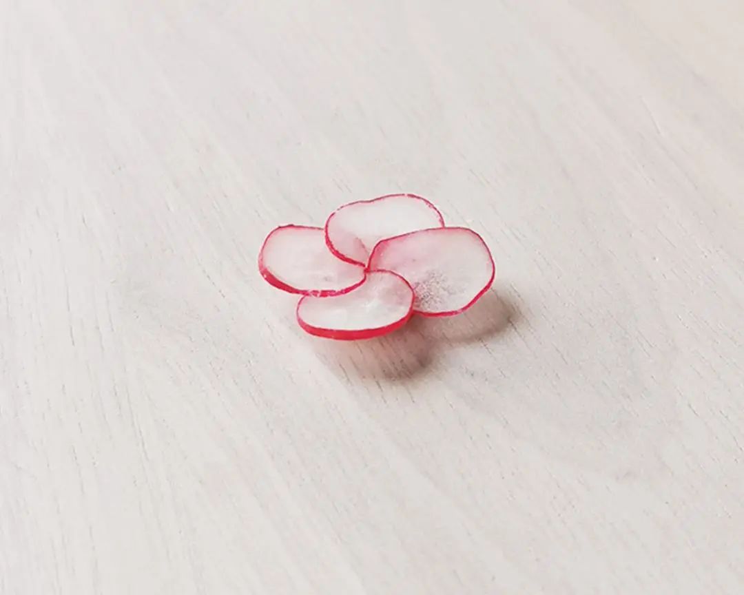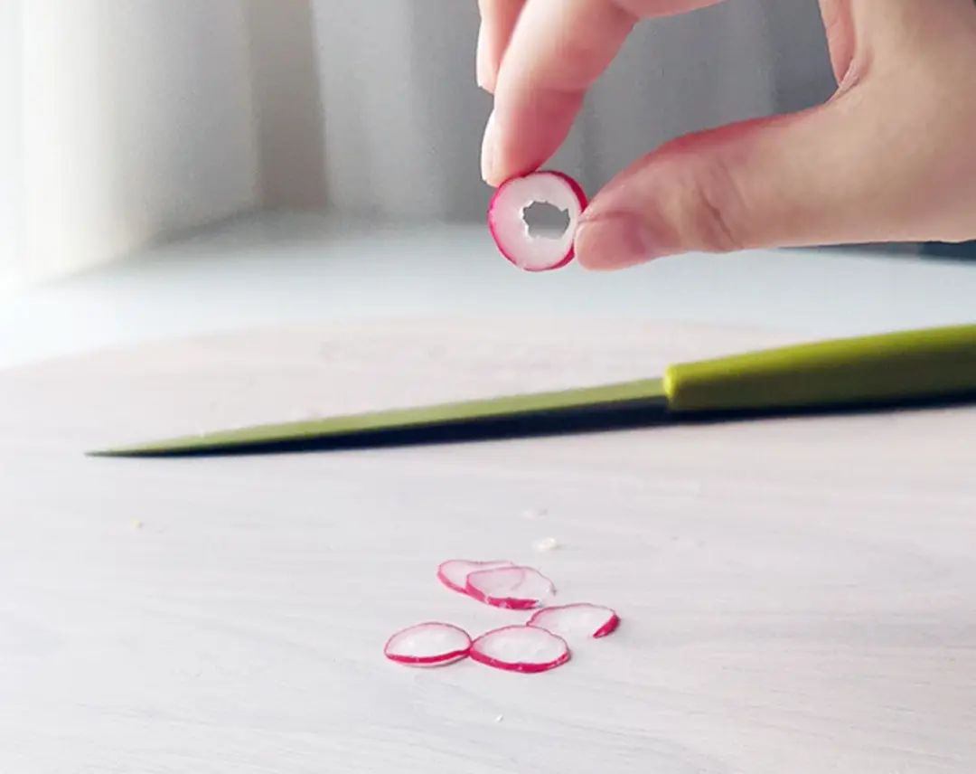 1. 樱桃萝卜切片,尽可能薄。