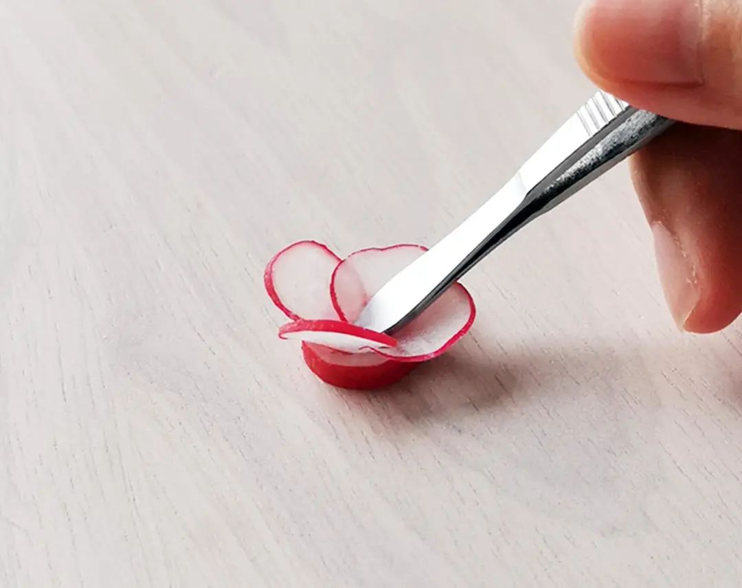 手指状长条形樱桃萝卜,能切出比球形樱桃萝卜更小、大小更均匀的薄片;没有长条形的,用球形樱桃萝卜也行,做出来的花会大一些。
