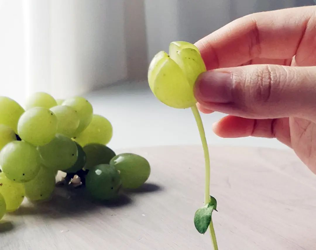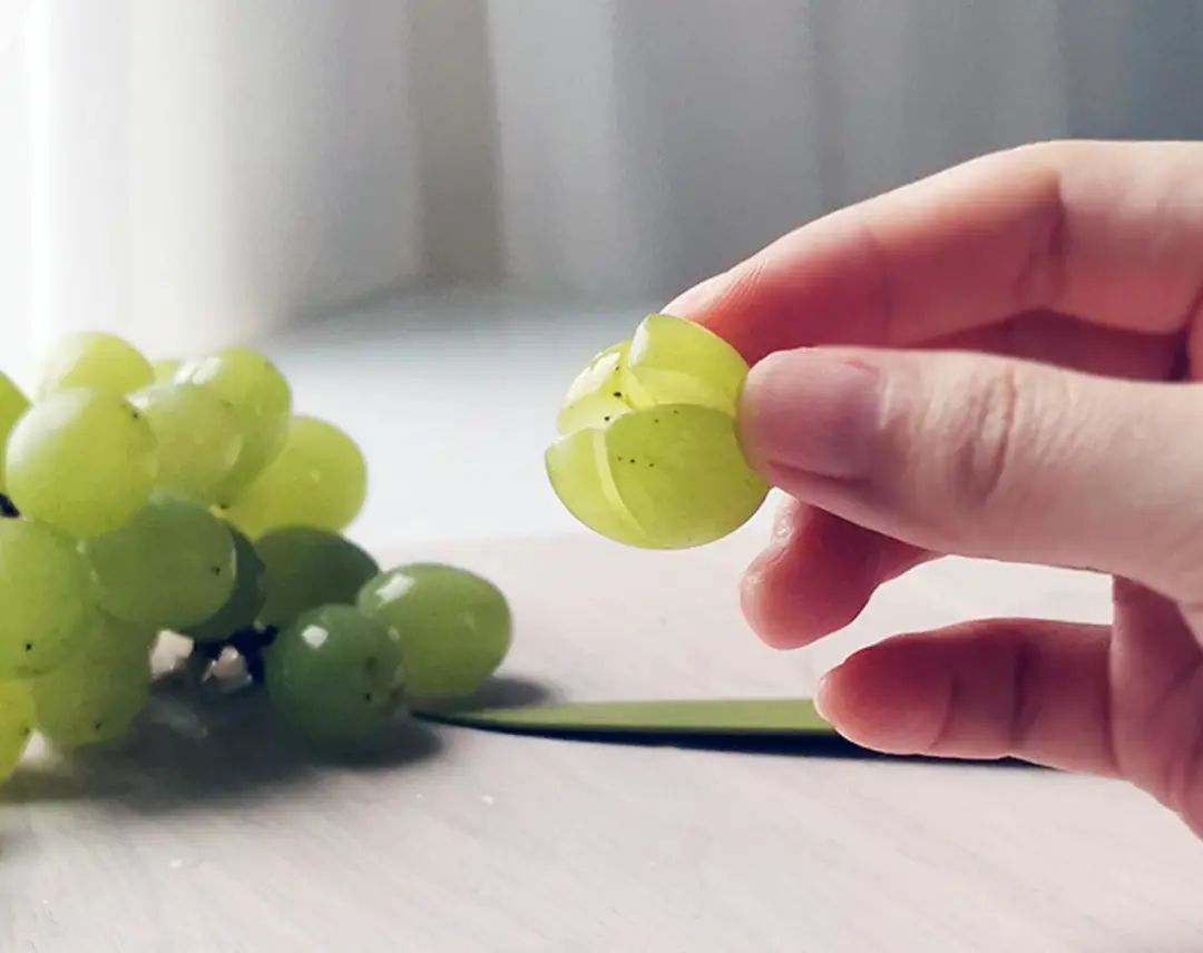 1. 捏住青提,在无柄的一端切十字,深度可以到青提高度的2/3。