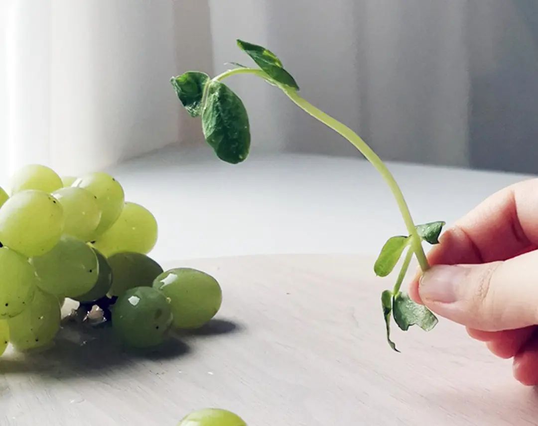 2. 取一根豌豆根,把顶部叶子掐掉,下方修掉太长的那一条叶子。