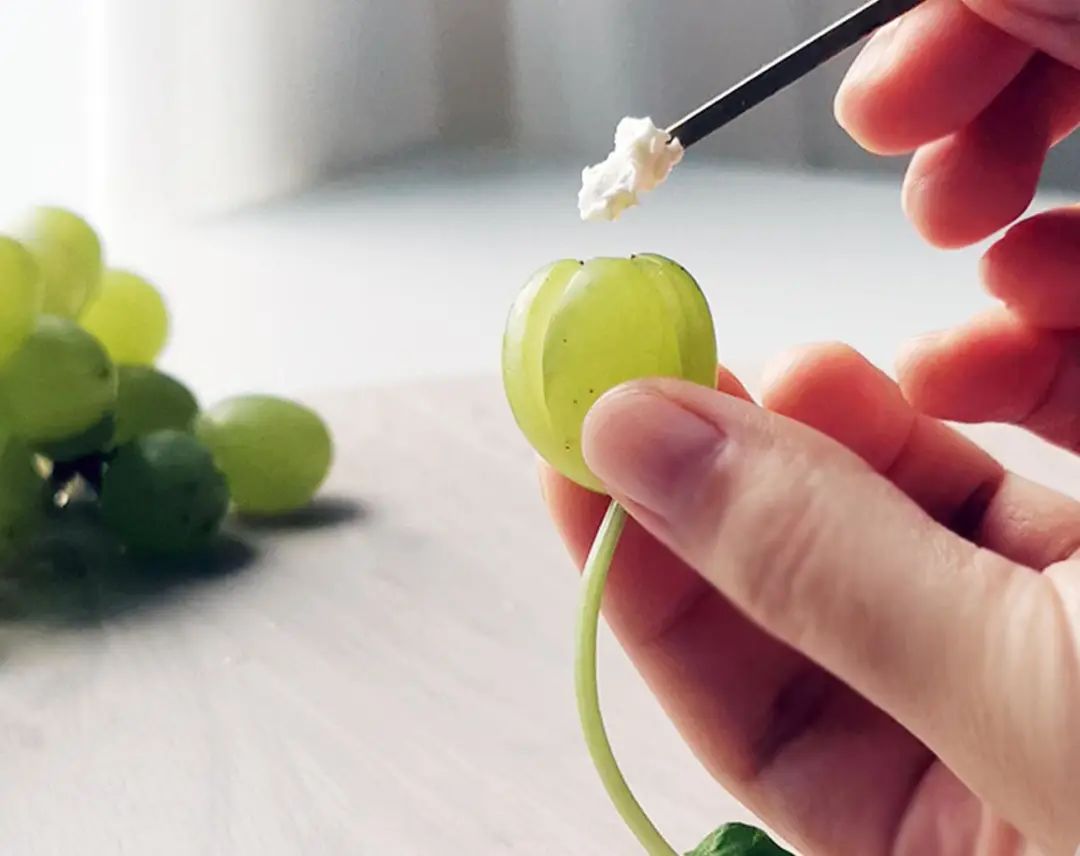 4. 用一支扁平、够窄的竹签或细勺柄,将奶油奶酪(或稠酸奶)抹进青提的切口。