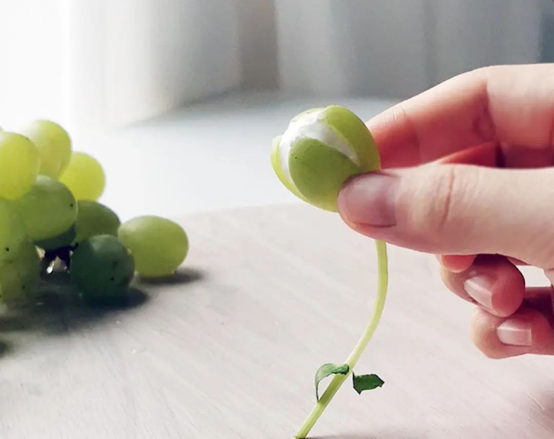 3. 把豌豆根顶部扎进青提底部,扎深一些。连接处可事先用牙签扎一下。