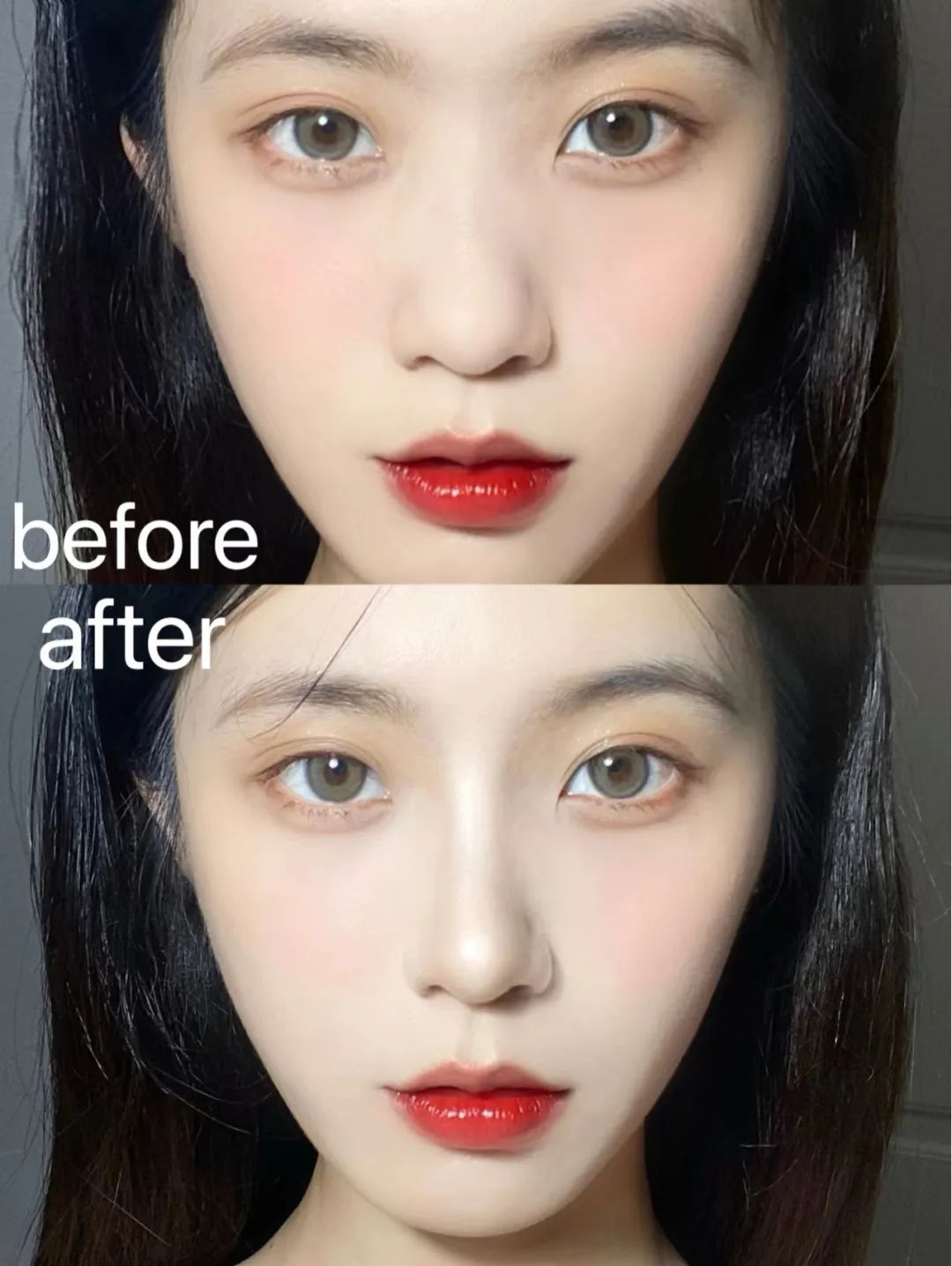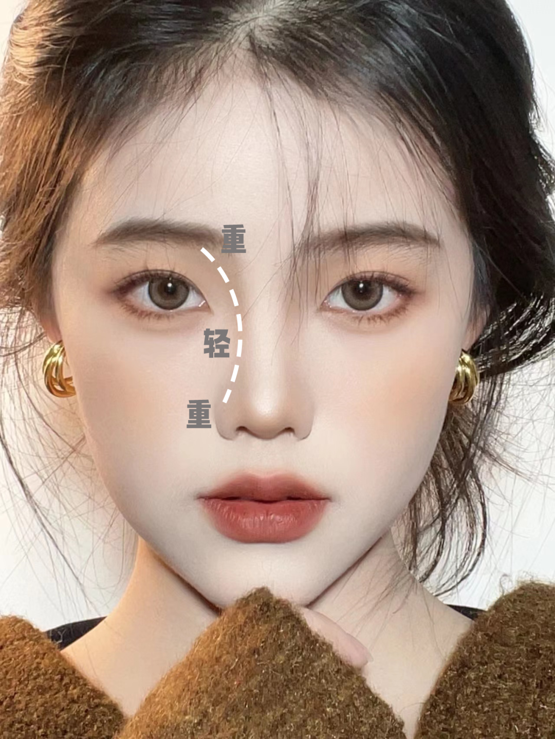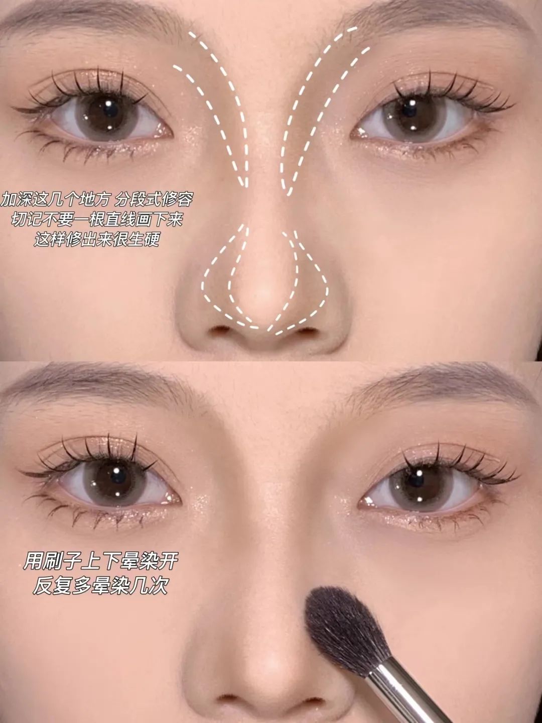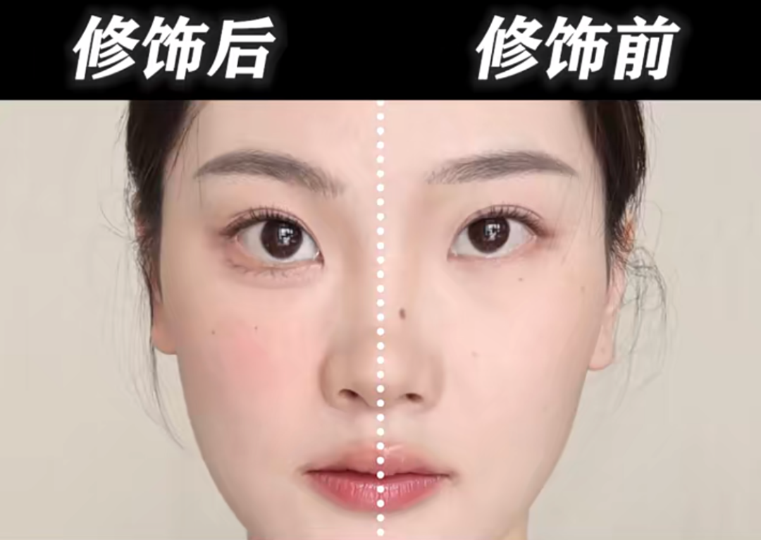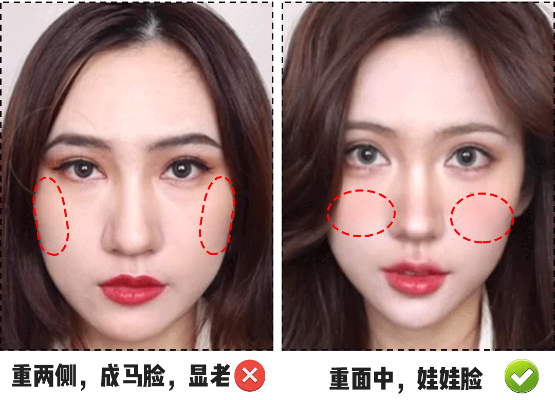 另外,还可以通过眉毛和腮红的位置来缩短中庭:把眉头往下压一点,视觉上看起来鼻梁就变短了。