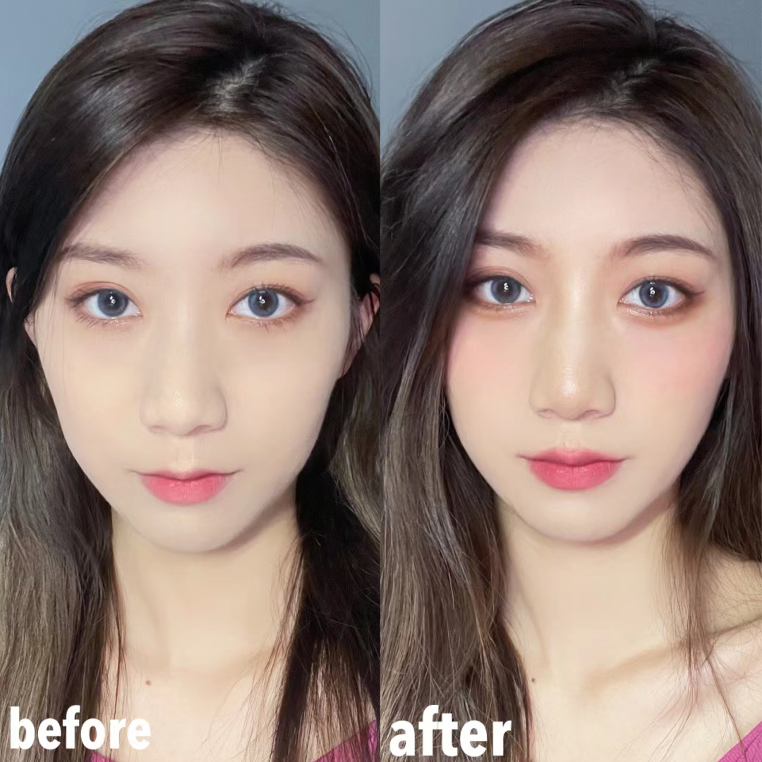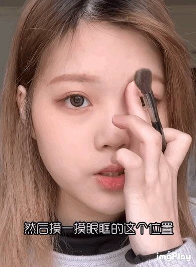 往上提拉打修容,用稍微大点的刷子轻轻带过,不需要完全涂黑,妆面看上去更加干净。