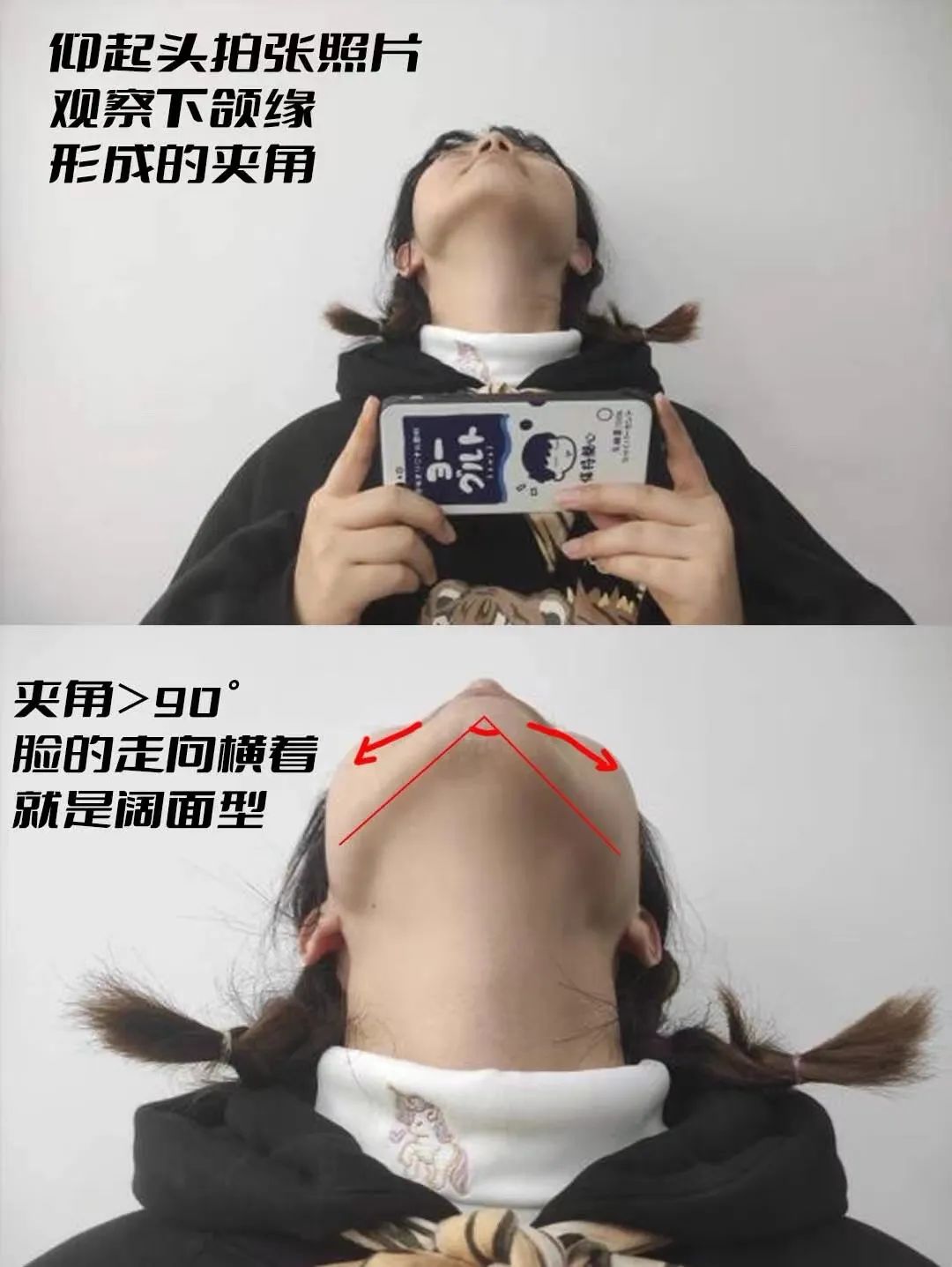抬头,打开前置摄像头拍一张照,看自己的下颌缘夹角,如果大于90度,那就是阔面脸