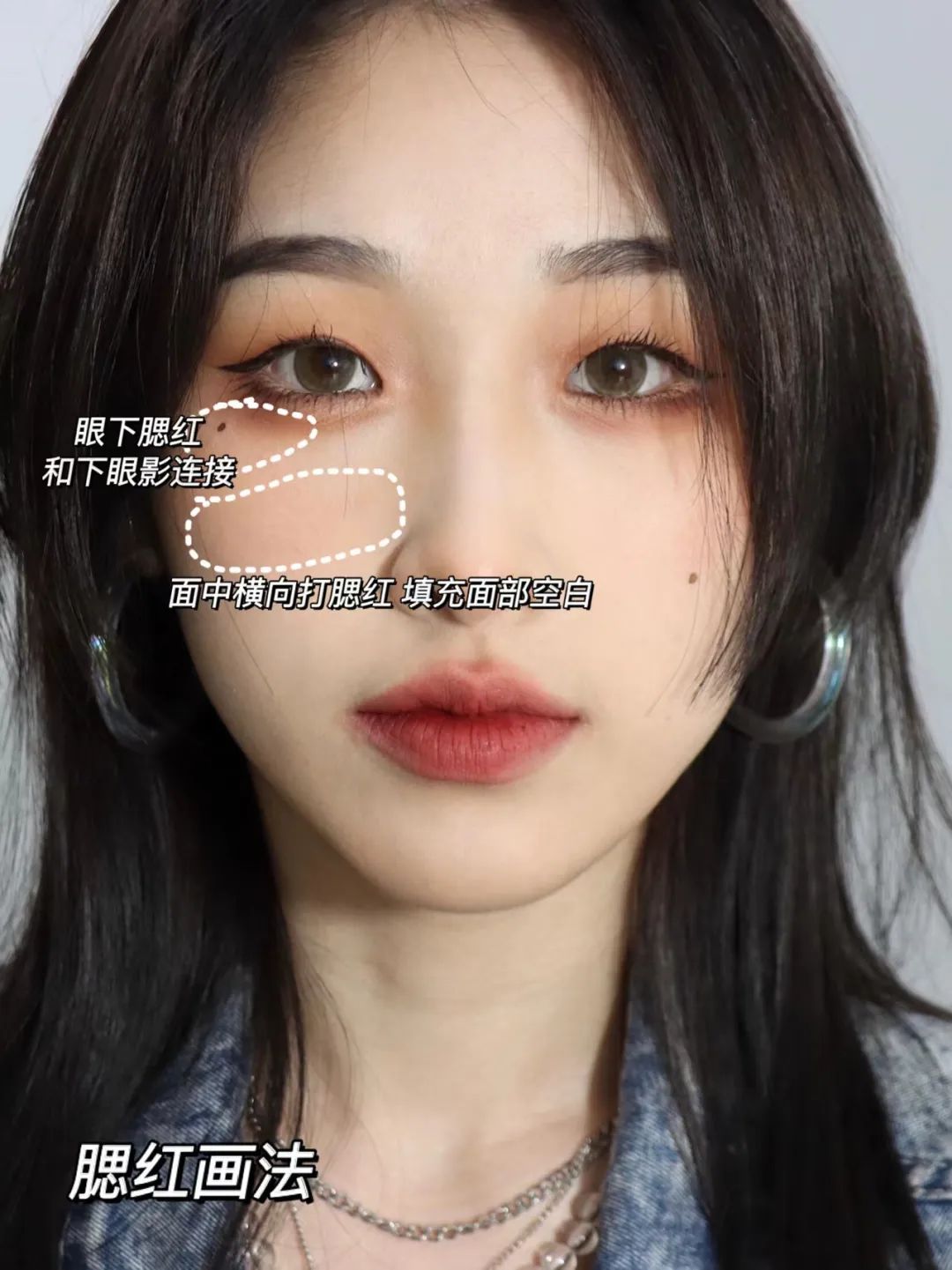腮红也可以横向打,从颧骨上方靠近外眼角的地方开始,往面中贴着下眼睑的弧度横扫