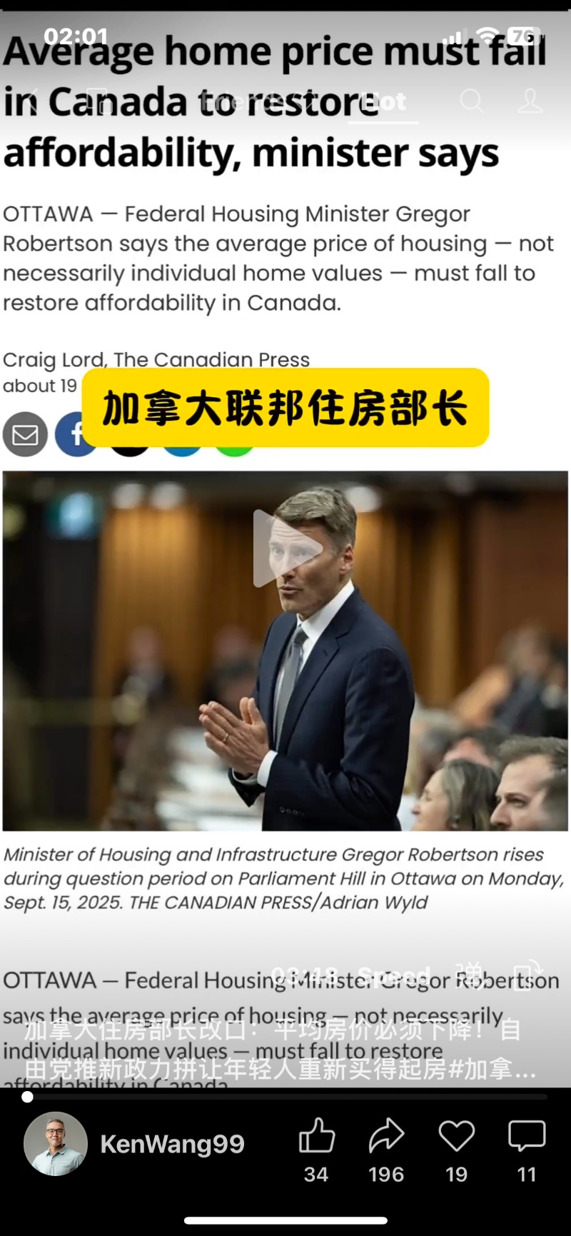 加拿大住房部长改变立场发话了 房价必须跌!- 可信吗?
