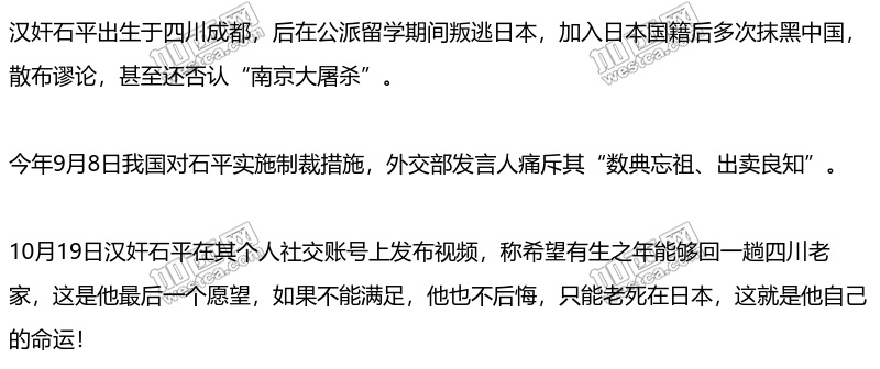 10月19日汉奸石平发布视频,称希望有生之年能够回一趟四川老家,这是他最后一个愿望!
