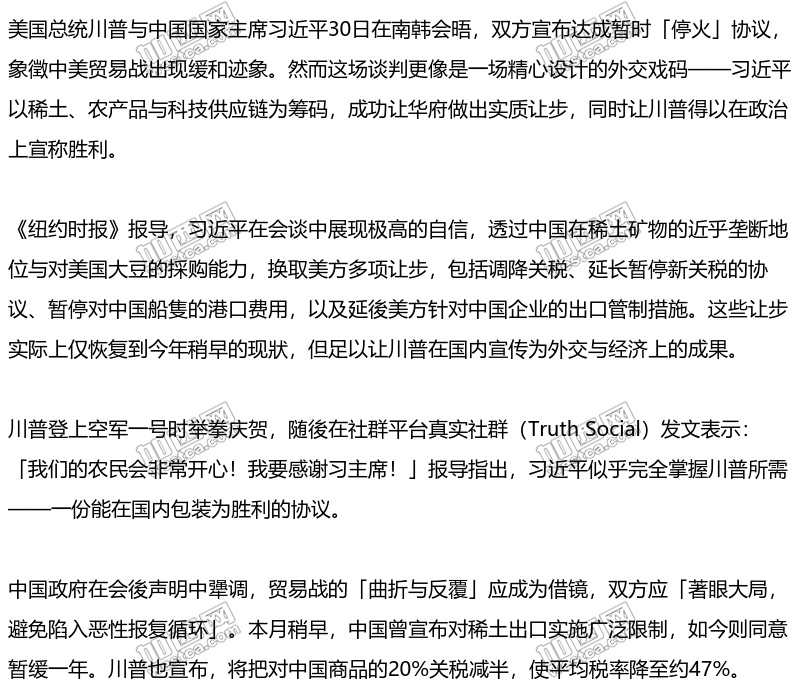 古二曝出录音大瓜,秦雯向王家卫炫耀袭警被抓后,随便找人捞自己 美国据报计划袭击委内瑞拉 马杜罗的选择正在减少 加州博物馆逾千藏品被盗或流入跳蚤市场 FBI介入 大温一超市获加国独立杂货商金奖 未开战先内讧 习亲升79上将近半折损 周末大温超市优惠抢先看 扫货指南 素里称需增派150名警员打击勒索案 2026最安全旅行国出炉 加拿大上榜 厅官3480万现金给女友买房银行拒存 掀开大戏 涉嫌大温公车站性侵少女 男子被捕 突发:传美已决定空袭委内瑞拉 油价拉升 3年能源价涨30% 温村这儿居民愤怒 加国各省薪资大比拼:你赚多还是少 高习会仅30分钟,双方都收敛笑容.... 暴雪大暴雪特大暴雪 中国西南和东北迎极端天气 邓亚萍在福建福耀科技大学开讲:"我不是催大家卷" 黄仁勋与李在镕 郑义宣 喝交杯酒 5岁女童被砸身亡,为何找不出责任方? 宽娱公司前员工称出差期间遭性侵,男方不予起诉 担心吃不饱?特朗普一到韩酒店就点了"汉堡薯条" 中共助电诈集团证据曝光  这个大官曾会陈志 白酒信仰彻底崩了:五粮液利润下滑65% 赌王小女儿现身韩国出席APEC峰会!大晒工作照! 网传于和伟1200万元片酬全捐烈士纪念馆?多方回应 套走300亿后,潘石屹夫妇现身美国,满脸笑意 柬电诈集团头目陈志1.5亿新元资产在新加坡遭冻结 金正恩爽过上流生活 朝鲜人却卖血400cc换3kg米 鲍威尔"罕见强硬"凸显美联储"内乱",降息"远非确定" 准备中美更大贸易战 川习停火抢时间 寻求筹码 川普强势主导  会前打情骂俏 习"压力山大" 卡尼出手!加国移民人数要对号入座 为什么中国和俄罗斯不怕美国 ! 彭博「点出关键」 名媛说登月是假?NASA爆气回应 提3证据 微软因OpenAI投资损失逾31亿美元 11月Cineplex影院上映$3.99 电影 川习会后 荷兰面临放弃安世半导体控制权压力 安世暂停向中国发货 大众汽车供应商减慢输出 上亿现金资产需3人平分!翁帆仅能到手5000万左右 川习会中国取得重大突破 美国政策方向重大转变 谷歌前CEO:当年李鸿章访美被震 如今外国人来华受惊 邓亚萍在福建福耀科技大学开讲:"我不是催大家卷" 阿雅一语戳破小S伪善:真正的思念,从不需要... 宽娱公司前员工称出差期间遭性侵,男方不予起诉 5岁女童被砸身亡,为何找不出责任方? 鲍威尔"罕见强硬"凸显美联储"内乱",降息"远非确定"